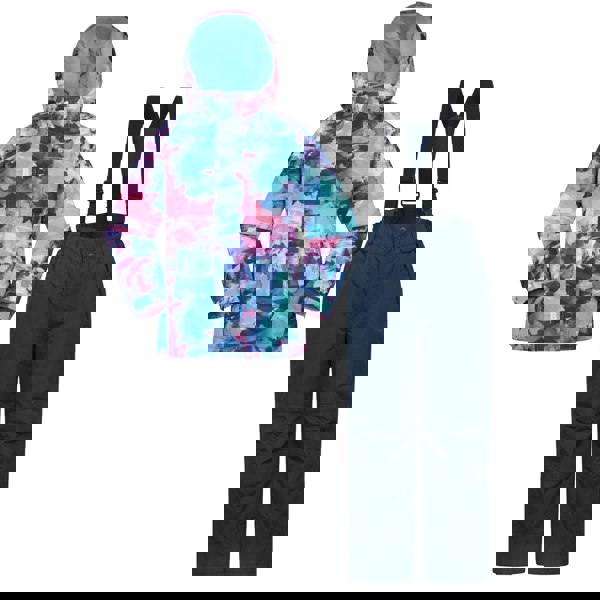 The jacket has a grown on hood, long sleeves and a full zip fastening with touch fastening. Adjustable cuffs use touch fastening tabs. Storage includes two side pockets and a ski pass pocket. The trousers include adjustable braces, concealed ankle zips and a snowskirt.