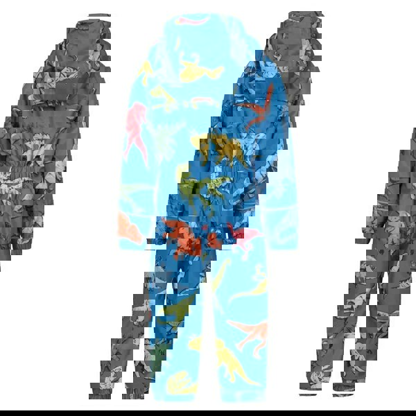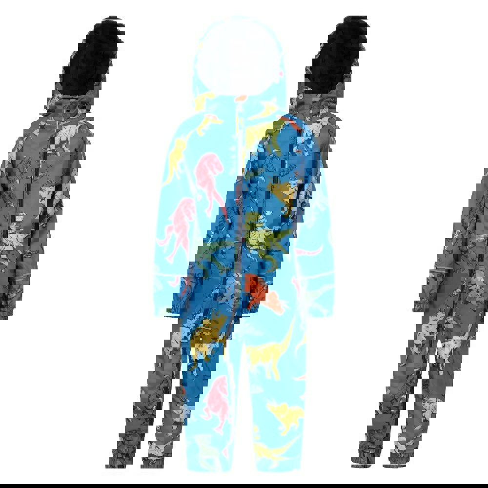 This kids’ rain suit from Mountain Warehouse comes in blue with a dinosaur and logo design. It is made from polyester and finished with a hooded neckline and long sleeves for full coverage.