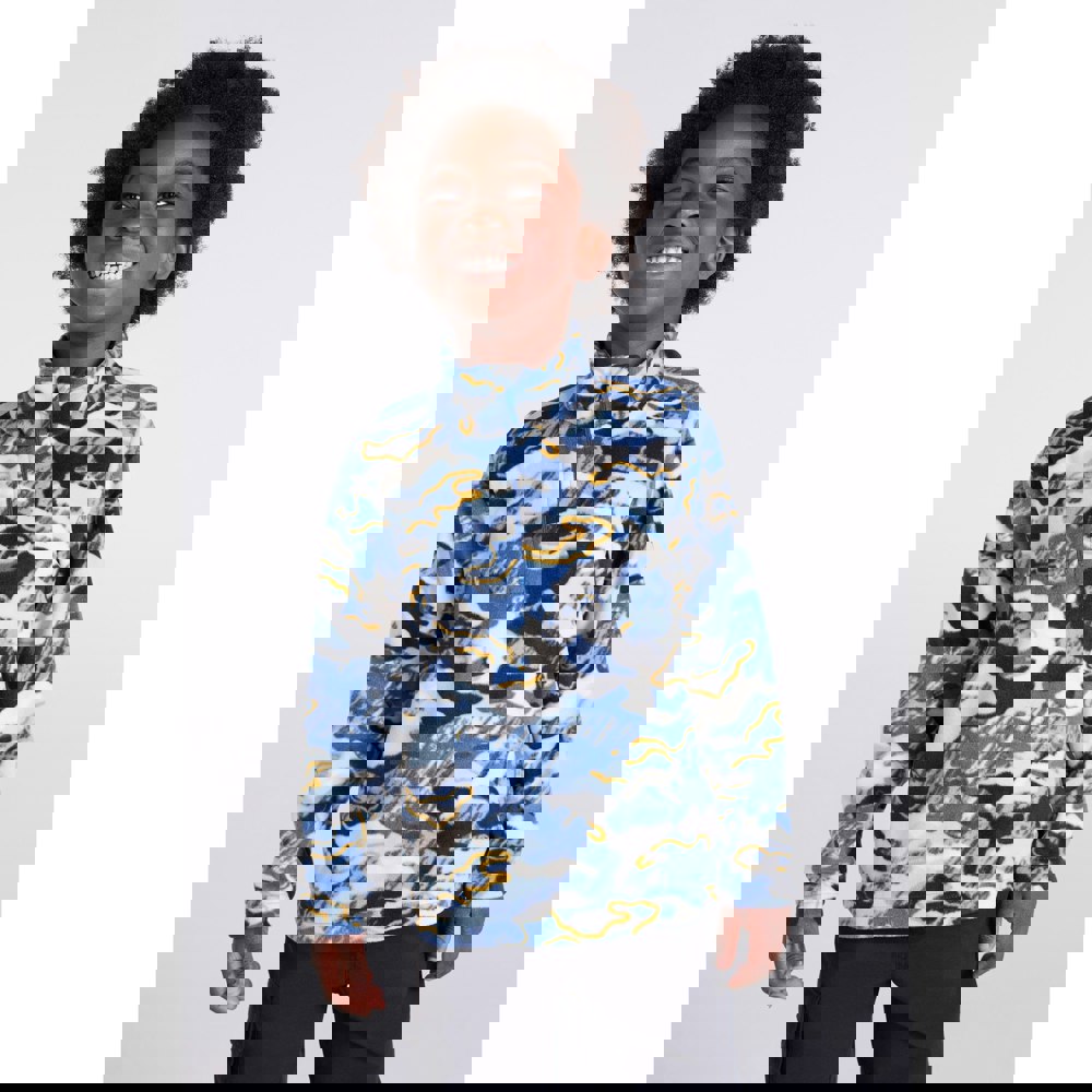 Mountain Warehouse Kids Pursuit fleece top in corn blue, made from microfleece with an all-over dinosaur skeleton print. The lightweight, breathable fabric includes quick-dry technology for practical everyday wear. A funnel neck and long sleeves create a covered shape, while the half zip fastening allows easy on and off and adjustable ventilation.