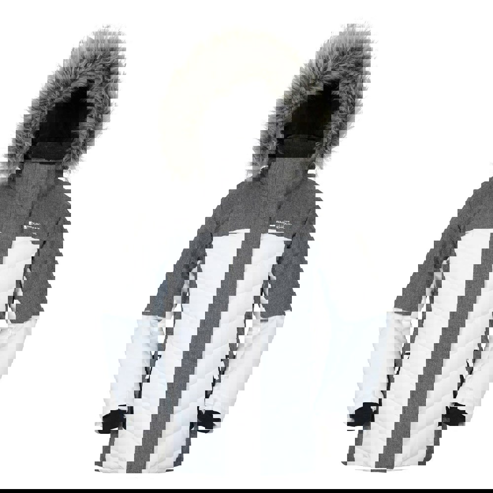 Mountain Warehouse Kids Pyrenees padded ski jacket in white with a two tone logo design. Made from 100% polyester, with breathable fabric technology and a waterproof rating of 3000mm. Thermal tested to -10°C and finished with Isotherm technology.