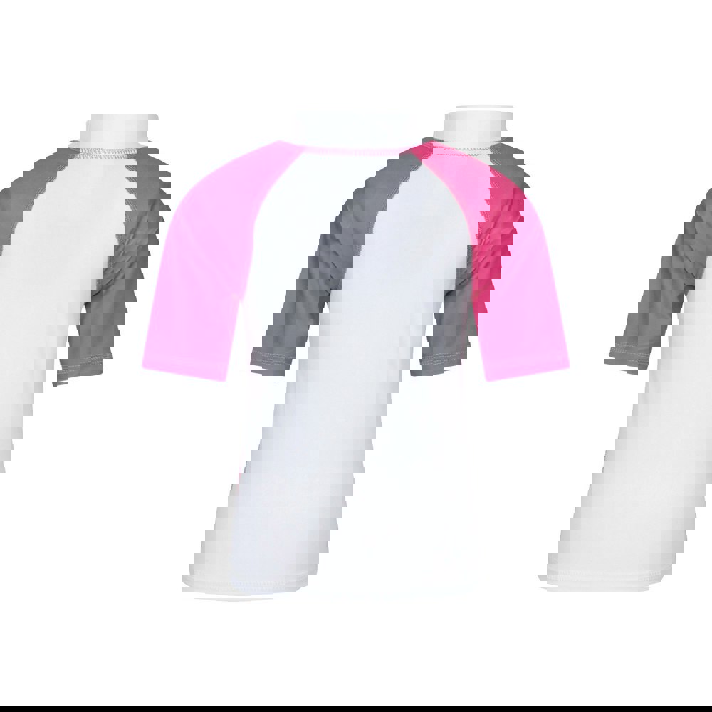 This kids rash guard set from Mountain Warehouse comes in bright pink with a printed flower design. Made from 100% polyester stretch fabric, it includes a short-sleeved raglan rash guard and matching shorts, plus a coordinating hat.