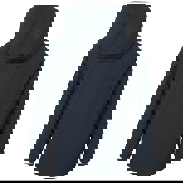 This kids soft shell jacket comes in black with a logo and text design. It uses a bonded, woven fabric with a hooded neckline and long sleeves. The hood is adjustable and sew-on, and the jacket fastens with a full zip.