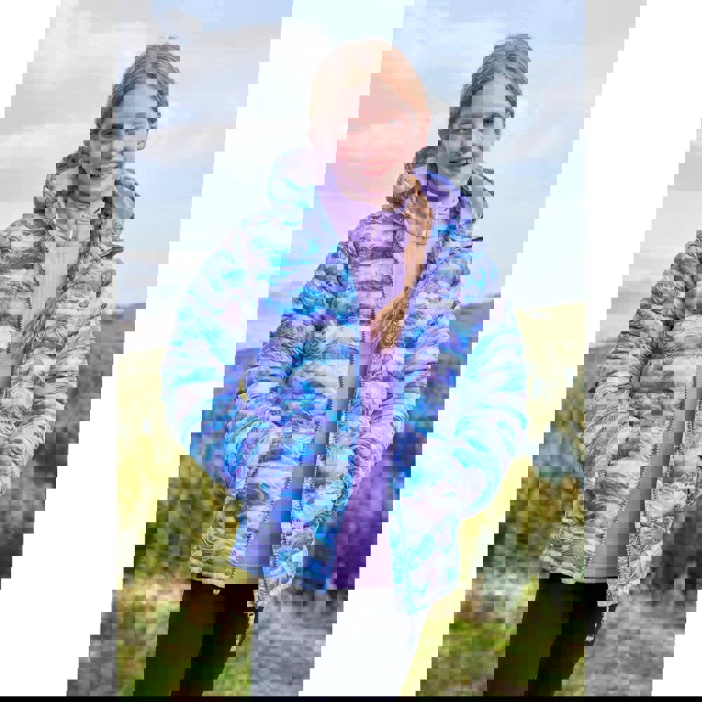 This kids padded jacket comes in pale blue with a quilted finish and a watercolour logo design. It uses microfibre filling and a lightweight, insulating construction, finished with a DWR coating for water resistance. A grown-on hood and long sleeves provide coverage, while elasticated cuffs create a neat fit at the wrists.