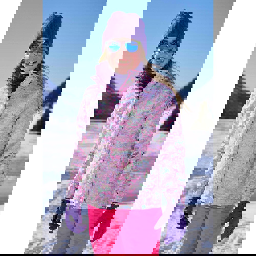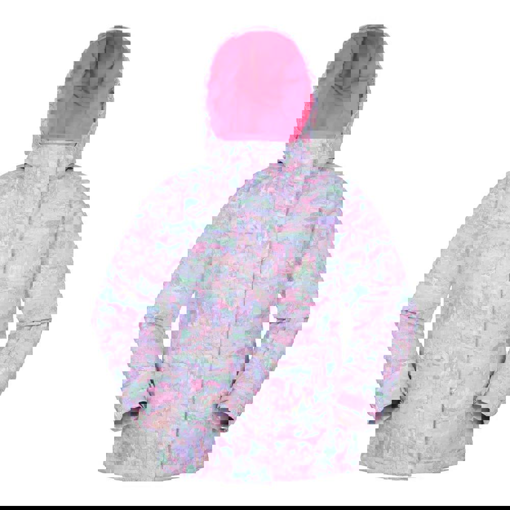 This kids’ ski jacket comes in pale blue with an all-over watercolour print and logo detailing. Made from 100% polyester, it uses a DWR finish and snowproof fabric technology. The jacket is fleece lined and includes a snowskirt for added coverage.