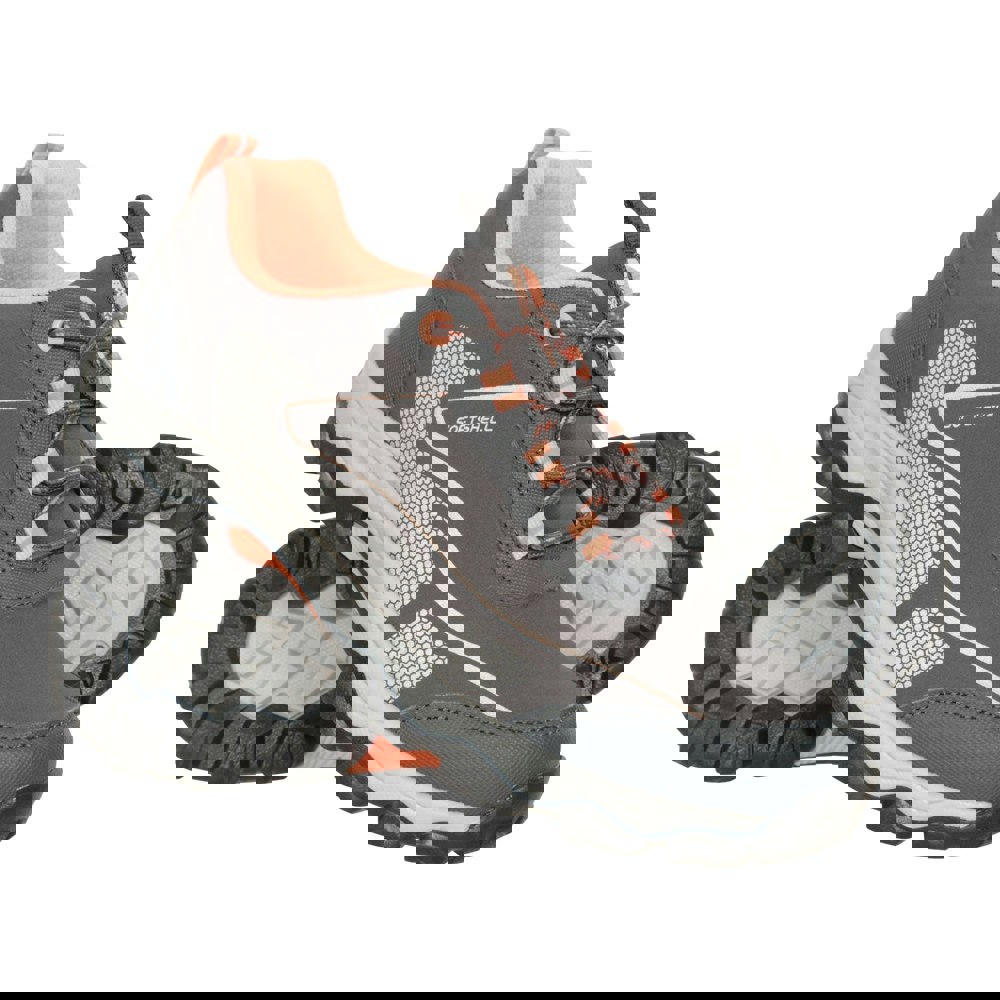These kids’ walking shoes from Mountain Warehouse use a softshell fabric with a low-cut profile and flat sole. The upper combines synthetic and textile materials, with a breathable mesh textile lining. An EVA footbed sits inside, and a pull tab helps with putting them on and taking them off.