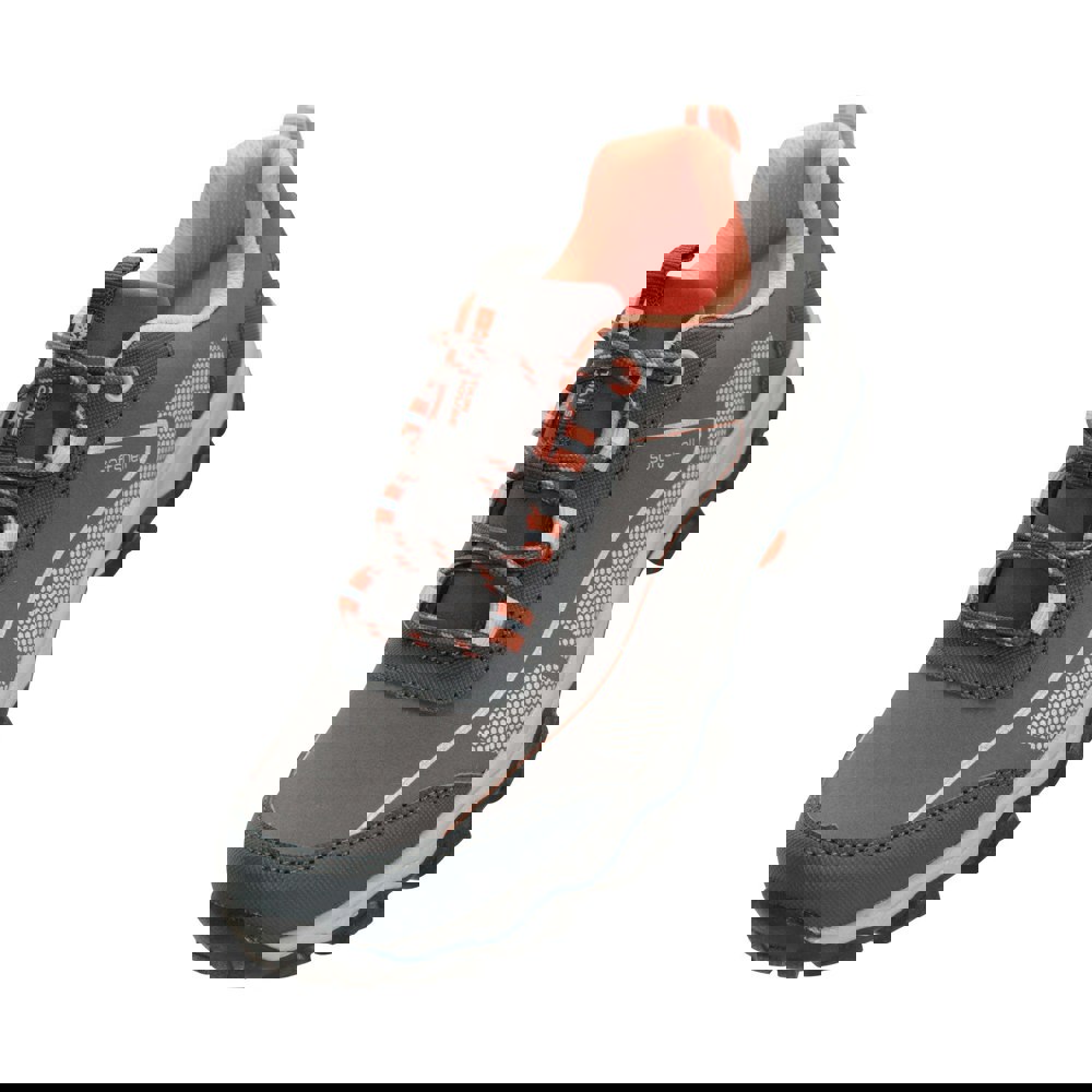 These kids’ softshell walking shoes from Mountain Warehouse come in light grey with contrast detailing, logo and text accents. The upper combines synthetic and textile panels, paired with a breathable textile mesh lining. A low-cut profile and flat sole keep the shape streamlined, while bungee lacing secures the fit through four eyelets.