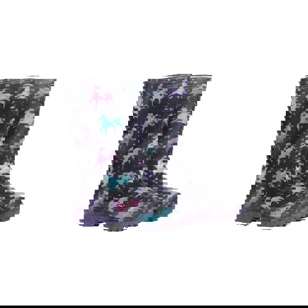 These kids’ wellington boots from Mountain Warehouse come in black with a playful unicorn and rainbow theme. The design includes clouds, rainbow stars and a unicorn, with flashing lights for an eye-catching finish. A pull-on fastening and round toe shape keep the look simple and practical, while the flat sole suits everyday wear.
