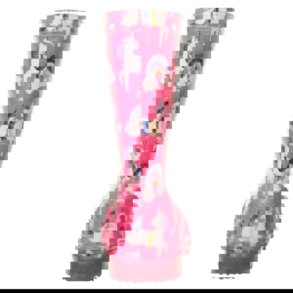 Mountain Warehouse Kids Splash Unicorn And Rainbow Light Up Wellington Boots in bright pink combine a playful printed design with practical wet-weather construction. The upper is made from rubber and the boots have a mesh lining. A round toe and flat sole keep the shape simple, while the pull-on fastening allows quick on and off.