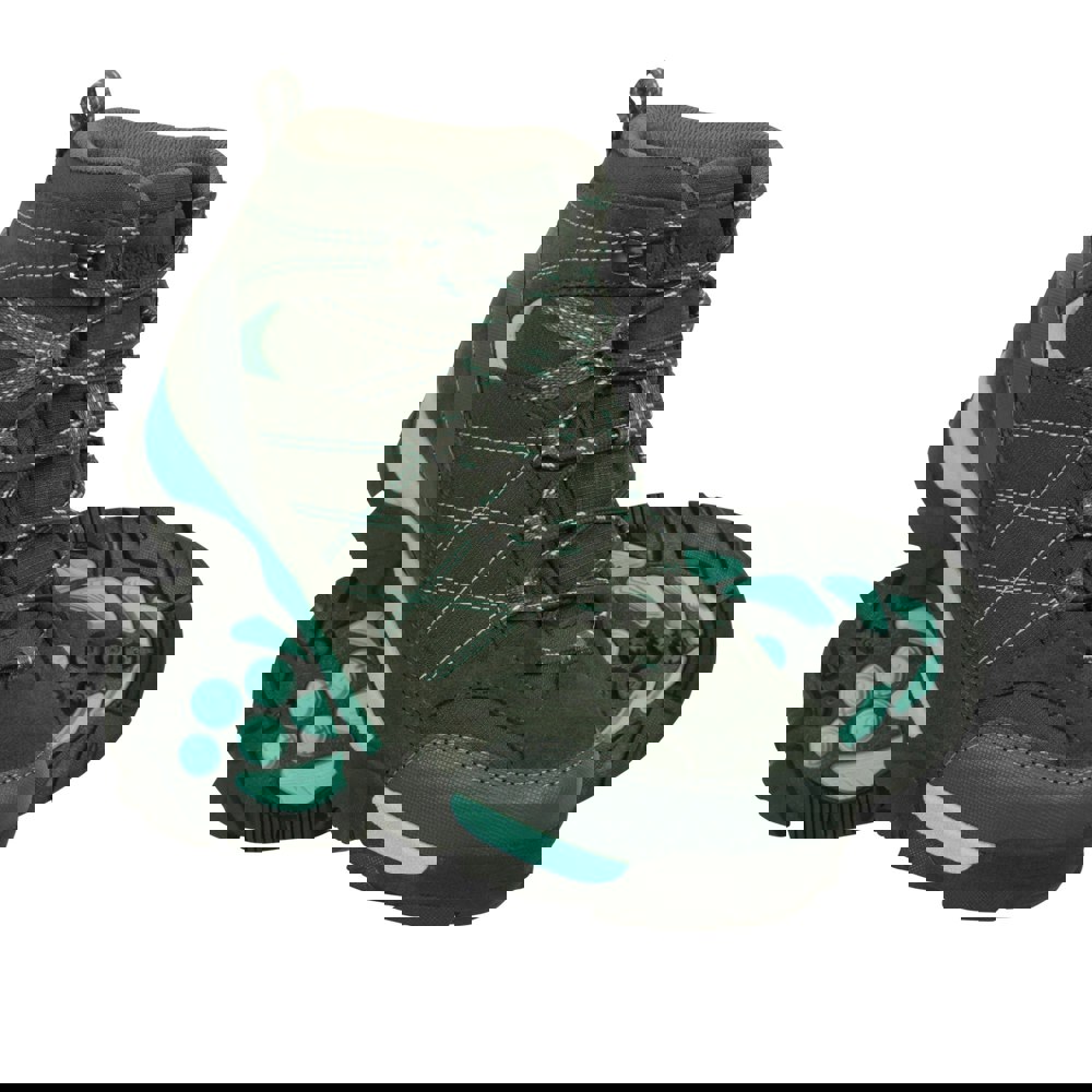 These kids’ trail walking boots from Mountain Warehouse come in teal with a logo design and a mid cut shape. The upper combines ripstop and suede, paired with a contrast mesh lining. Underfoot, a cushioned midsole uses EVA (ethyl vinyl acetate) and phylon, finished with a heavy duty sole and high traction grip outsole.