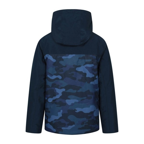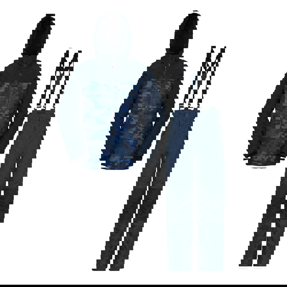 Mountain Warehouse Kids Vortex Extreme waterproof ski jacket and trousers set in black. Made from 100% polyester, this lightweight and breathable set is PFC free and waterproof, with a 3000mm waterproof rating and 2000g/m²/24hrs. The design combines camo and colour block panels with logo and reflective detail.