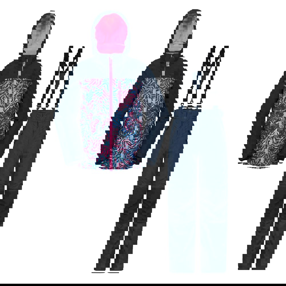This kids’ Vortex Extreme ski set from Mountain Warehouse includes a waterproof jacket and matching trousers in navy. The design combines camo and colour block panels with a logo, plus reflective detail. Made from 100% polyester, the fabric is lightweight, breathable and PFC free, with a waterproof rating of 3000mm and breathability of 2000g/m²/24hrs.