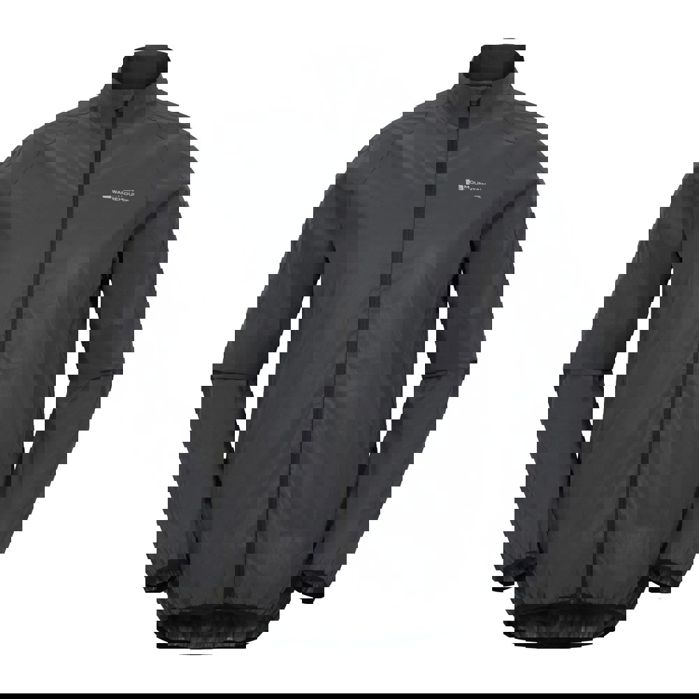 Built for lightweight outer layering, this jacket is made from 100% polyester and finished in black. The design includes a logo and reflective detailing, paired with a high-neck collar and long sleeves for added coverage. A full zip fastening keeps the front clean and easy to adjust, while elasticated cuffs and an elasticated hem help secure the fit.