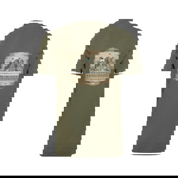 The design includes a mountain graphic with a logo, plus a badge detail and back print. Sustainability details include eco friendly production, GMO free cotton and lower water consumption, with a toxin free finish.