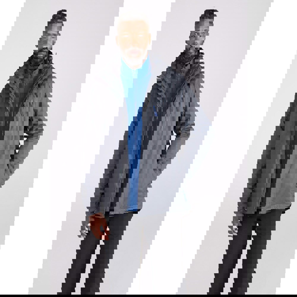 The Bracken Extreme 3 in 1 jacket from Mountain Warehouse is a waterproof softshell style in alloy grey, built with a woven outer and a mesh lining. It includes a removable inner jacket for adaptable wear, with a hooded neckline and long sleeves. The detachable hood has a toggle adjuster, while the hem adjusts for a neater finish.