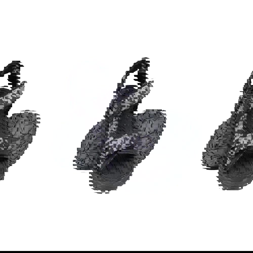 Mountain Warehouse Crete camo sandals in dark grey with an open toe and flat profile. The upper is made from phylon and finished with a touch fastening strap for a secure, adjustable feel. A soft neoprene lining sits alongside a cushioned insole and foam footbed for added underfoot comfort. Underneath, the deep lug outsole is built for durability and grip.