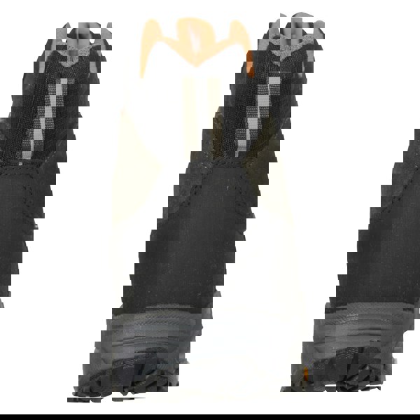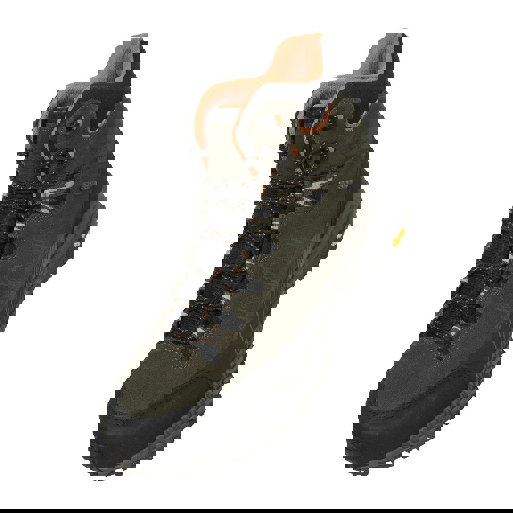 These men’s walking boots combine leather and suede uppers with an ankle cut and a flat profile. The design includes logo and text detailing, finished with a round toe and a reinforced toe with a rubber toe bumper.