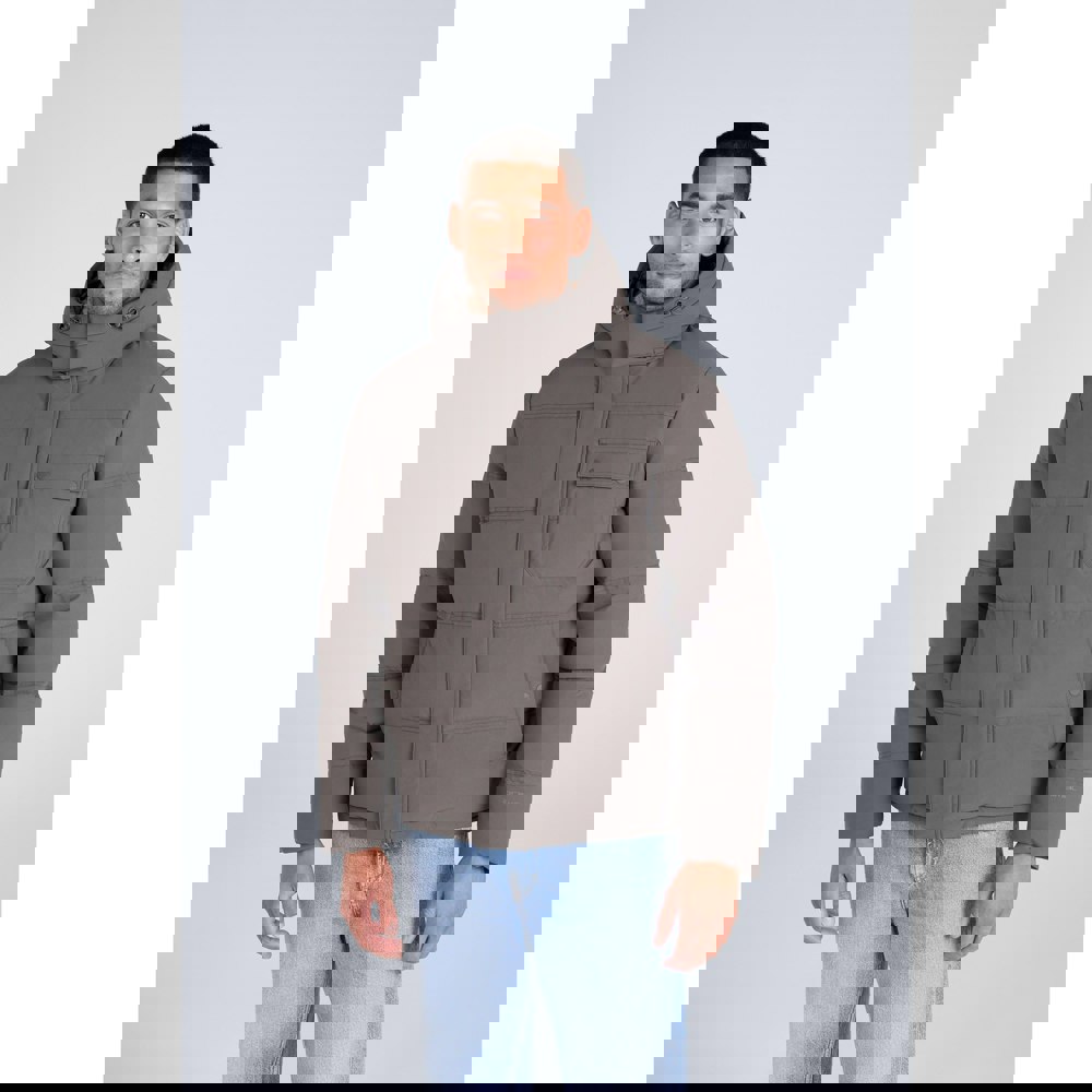 This padded gilet is made with a 100% cotton outer, a 100% polyester lining and 100% recycled polyester filling. Finished in khaki grey, it has a plain, quilted look with logo detailing and a standing collar for a clean, structured shape.