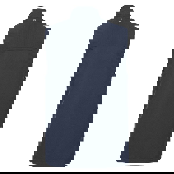 The Mountain Warehouse Grasmere gilet is a sleeveless layer in dark blue, made from polyester and elastane with a fleece lining. It has a plain finish with logo detailing and a standing collar.