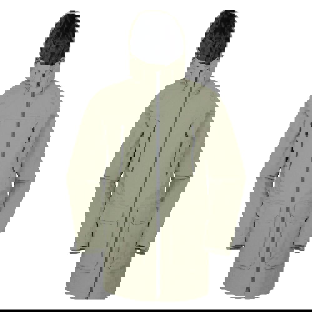 This pale green Hastings jacket from Mountain Warehouse is a long, hooded waterproof style with a plain finish. The outer is made from 100% polyamide with a 100% polyester lining, and it includes taped seams for added protection. A full zip fastening and long sleeves with touch fastening cuff tabs keep the look practical and streamlined.