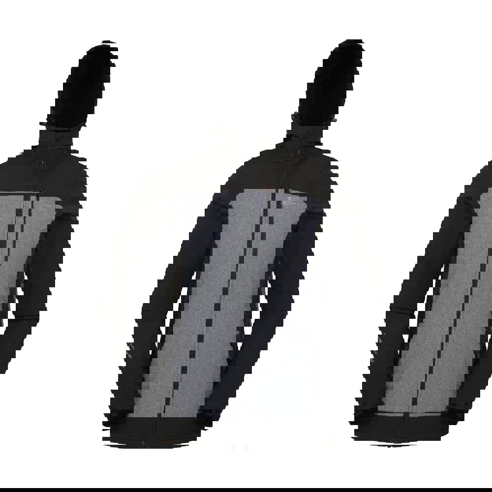 This soft shell jacket is made with a bonded fleece fabric and a shell of elastane and polyester, finished with a polyester lining. It has a hooded neckline with an adjustable grown on hood, plus long sleeves with touch fastening tabs at the cuffs. A full zip fastening and an adjustable hem allow the fit to be altered as needed.