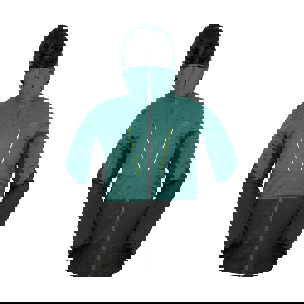 A hooded neckline is paired with an adjustable grown-on hood for a secure feel. The detachable snowskirt supports a streamlined fit on the slopes. Storage includes a ski pass pocket, two chest pockets and two side pockets, with flap closures where stated. A zip fastening completes the outer, and hook and loop cuff straps allow simple adjustment.
