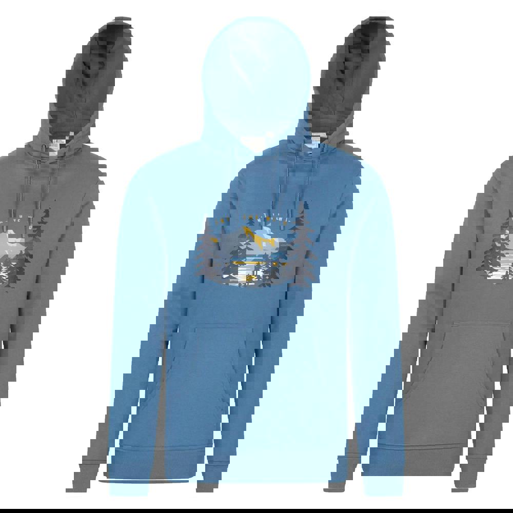The design combines mountain and tree graphics with streamers and text. A pull over fastening keeps the look clean, while two kangaroo pockets add practical storage. Long sleeves complete the classic hoodie shape for everyday wear.