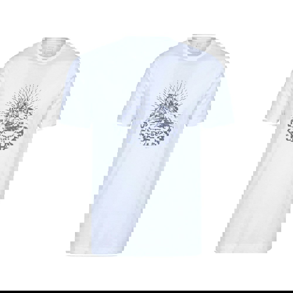Mountain Warehouse Inverness short-sleeved T-shirt in white. Made from 100% organic cotton, it has a crew neck with a ribbed elastane finish. The design includes a mountain print with text, keeping the look simple and graphic for everyday wear.