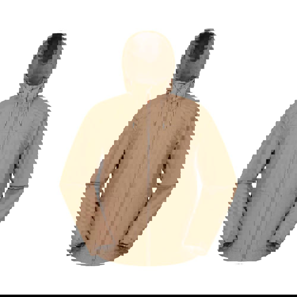 Mountain Warehouse Iona soft shell jacket in tan, made from 100% polyester with a plain finish. The lightweight outer is windproof and water resistant, with a durable water repellent finish and a PFC-free construction. A hooded neckline and long sleeves provide practical coverage for everyday wear.