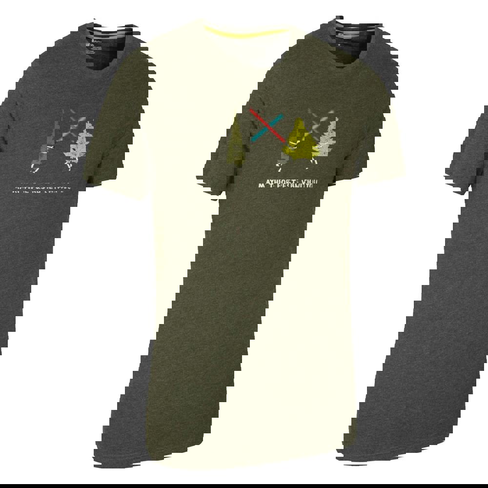 Mountain Warehouse “May The Forest Be With You” T-shirt in khaki green with a relaxed fit and crew neckline. Made from organic cotton with added elastane, it has a lightweight feel and short sleeves for easy everyday wear. The front print combines lightsaber, text and tree graphics, and the fabric includes UV protection with a UPF 50+ sun rating.