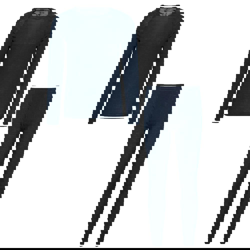 This thermal base layer set includes one top and one pair of bottoms. Made from a merino wool and polyester blend, it has a plain finish and an elasticated waistline on the bottoms.