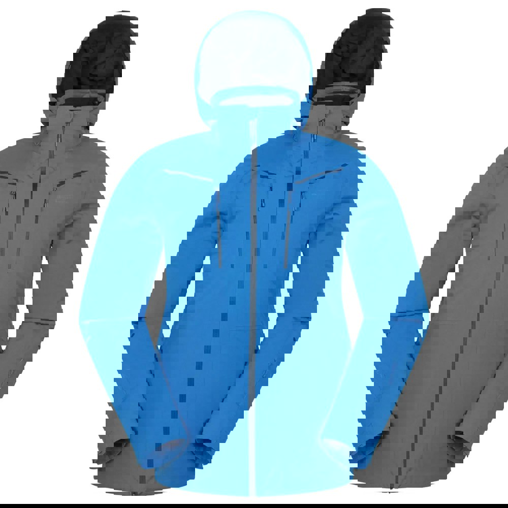 Built with a high collar and long sleeves, it fastens with a full zip and includes a detachable, lined hood. Practical ski-specific details include a powder skirt and snowskirt, plus a ski pass pocket with zipped storage on the sleeve. The fabric technology is breathable and thermal, with a waterproof rating of 10000mm and breathability of 5000g/m²/24hrs, suitable for heavy rain.