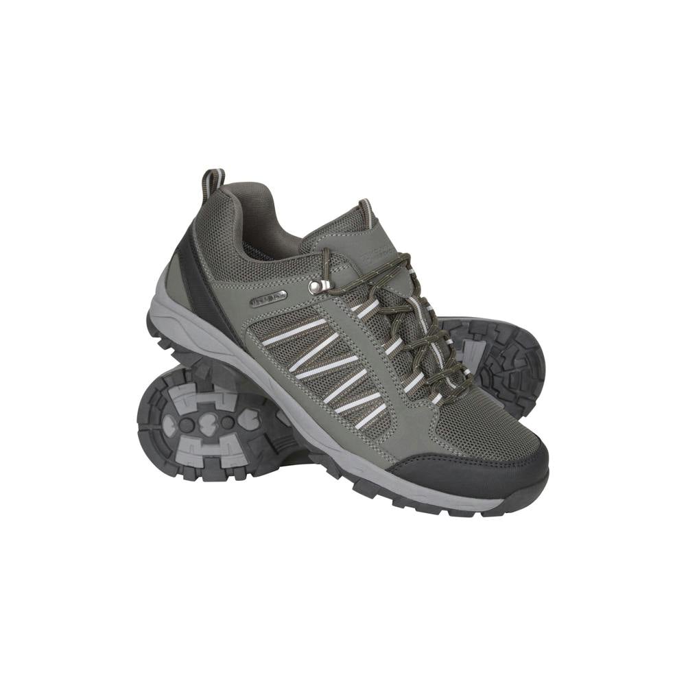 Built for wet-weather walks, the Mountain Warehouse Path Waterproof Walking Shoes bring a practical, low-cut profile in khaki green. A lace-up fastening runs through five eyelets for a secure fit, while the round toe keeps the shape classic and easy to wear. Contrast detailing is finished with logo and text accents for a clean, outdoors-ready look.