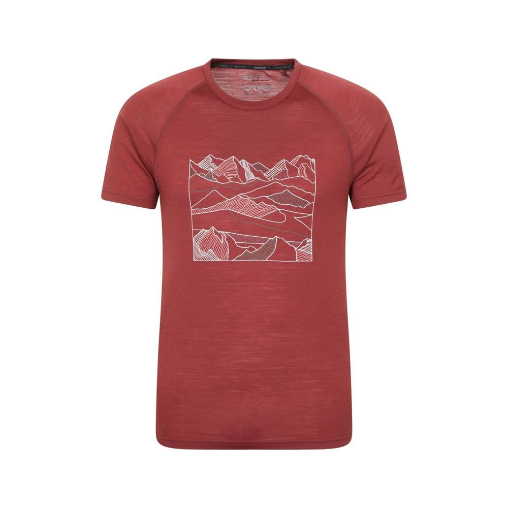 Mountain Warehouse Quest printed thermal top in a merino blend, finished in burgundy. Made from 50% polyester and 50% merino wool, it has a soft-touch feel and a lightweight construction. The design combines mountain graphics with numbers and text for a bold, printed look.