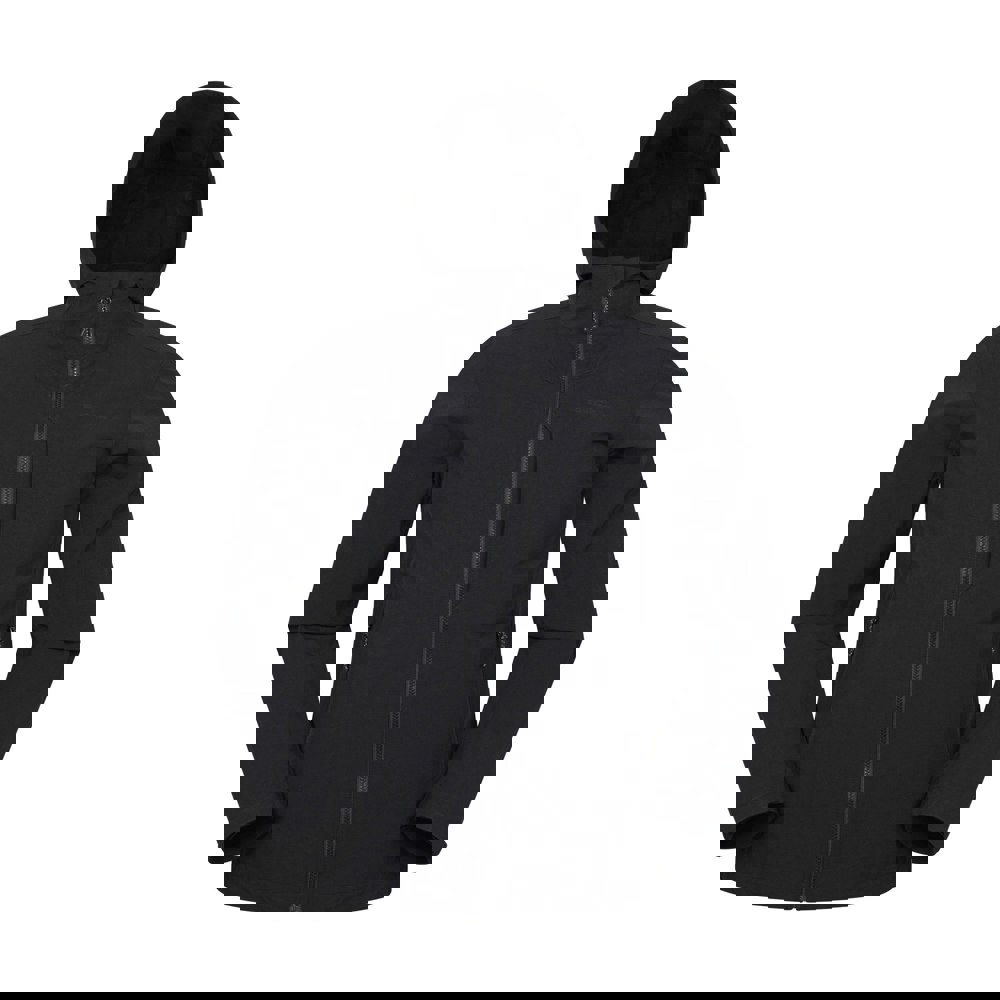 This packable soft shell jacket is made from a blend of elastane, polyamide and polyester, with mesh and stretch fabric. The design is plain with a logo, and it includes a hooded neckline with a sew-on hood. Long sleeves are finished with touch fastening tabs at the cuffs.