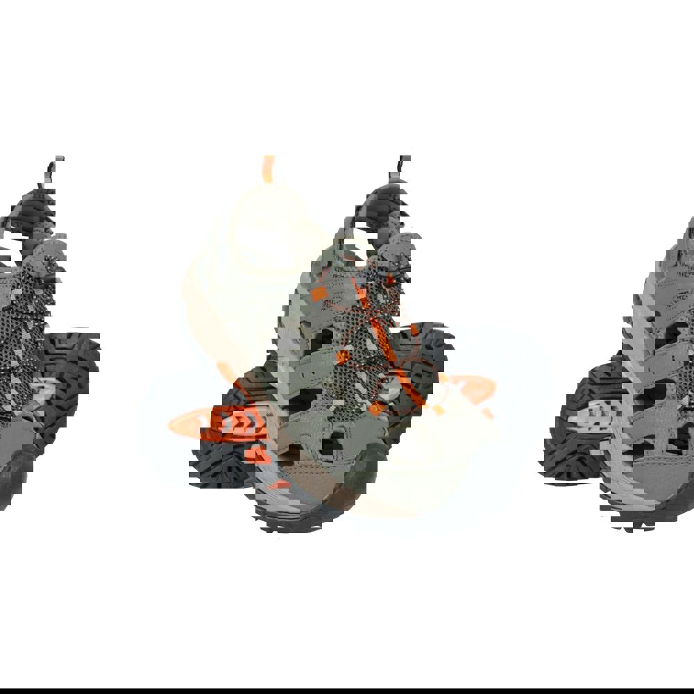Mountain Warehouse Rift drainage sandals in khaki green with a mesh upper and soft neoprene lining. A cushioned phylon midsole sits underfoot, finished with a rubber outsole and flat heel. The design includes a logo detail, a bumper toe style and a reinforced toe for added structure.