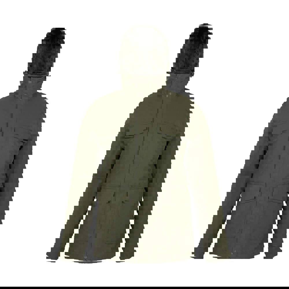 The jacket uses breathable, waterproof fabric technology and includes an anti-pilling finish. Storage is provided by two side pockets and two chest pockets with flap closures. A full zip and press stud fastening complete the front.