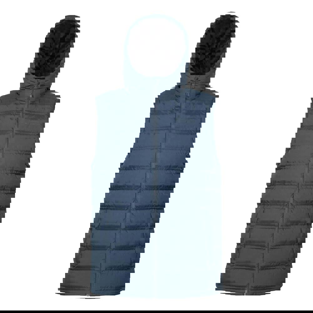 This hooded padded gilet is made from microfibre with a printed logo design. It has a sleeveless cut and a grown on hood for simple, practical coverage. A full zip fastening keeps the front clean and easy to wear, making it suitable for layering over everyday outfits.
