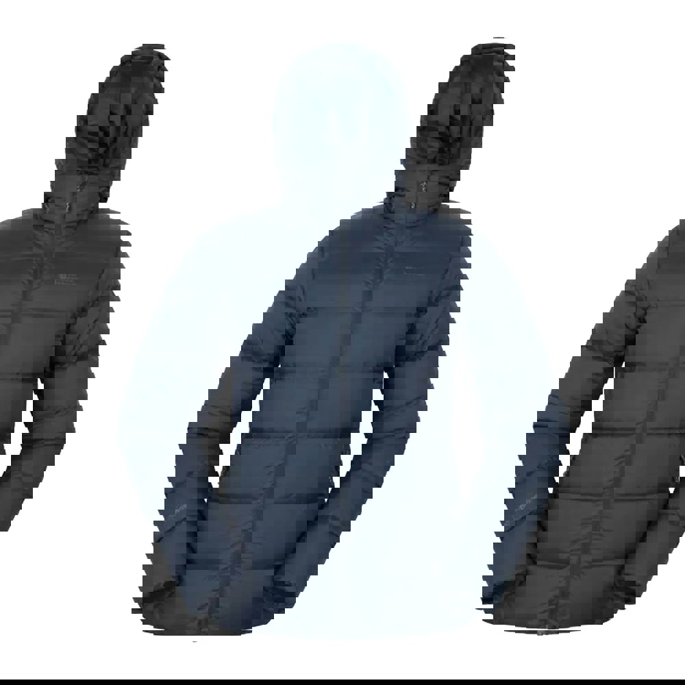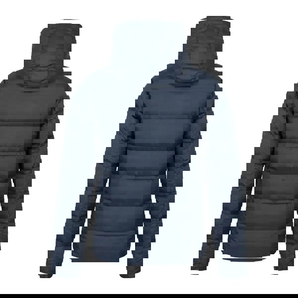This packable hooded jacket is made from 100% polyamide and finished in navy with a logo design. It uses durable water repellent finish and water resistant fabric technology, with thermal testing to -30c. A fused stand up collar sits alongside the hooded neckline, while long sleeves and an adjustable hem complete the silhouette.