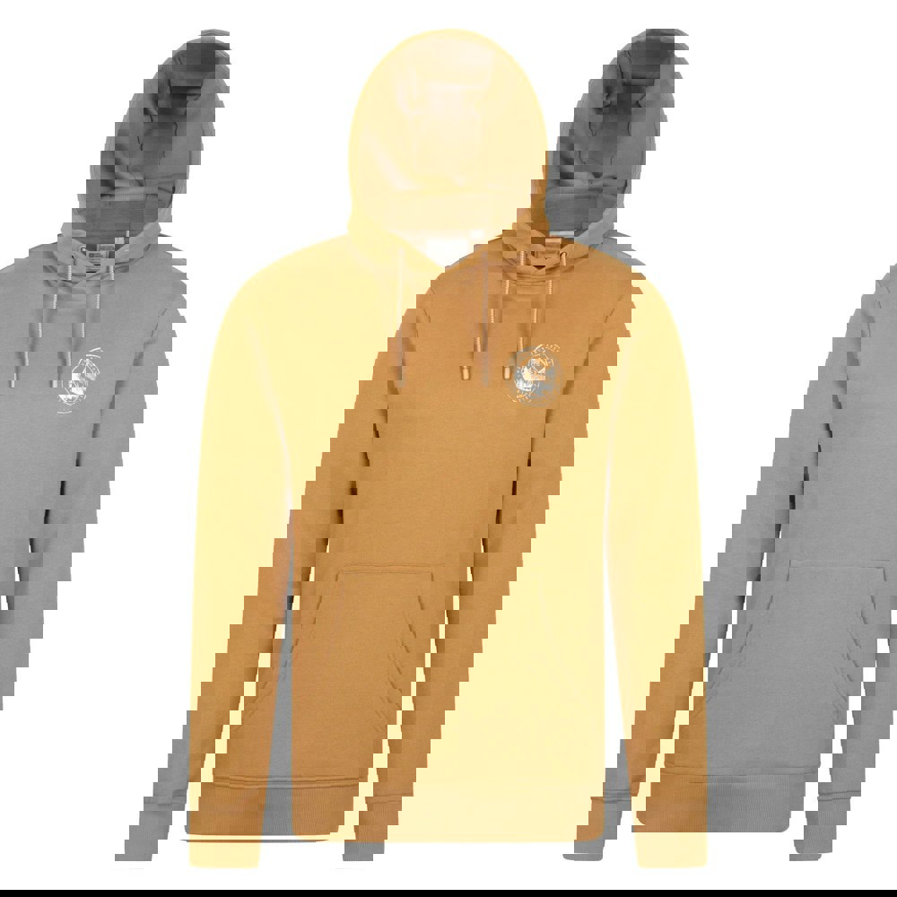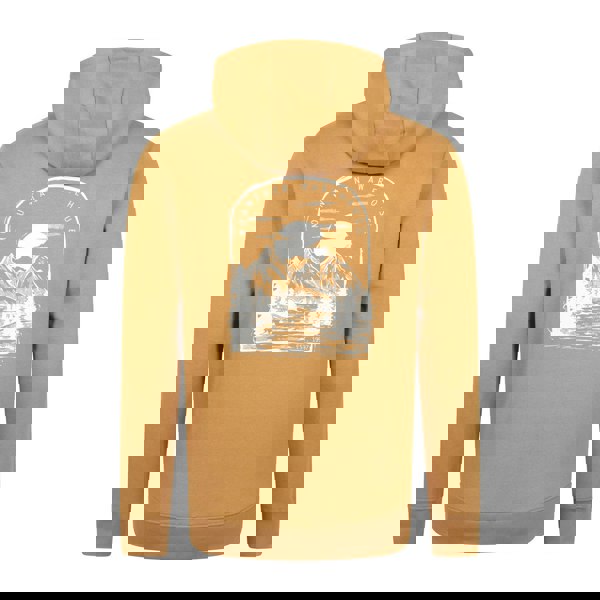 The design combines a plain base with graphic elements, including a back print and logo details. A kangaroo pocket at the front adds practical storage, making it a straightforward option for everyday casual wear.