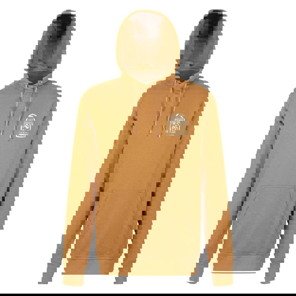 This men’s hoodie from Mountain Warehouse comes in mustard yellow with a circular graphic print showing a mountain and sunset. Made from a cotton and polyester blend, it has a soft handle and uses breathable fabric technology with fade resistant and peel resistant properties.