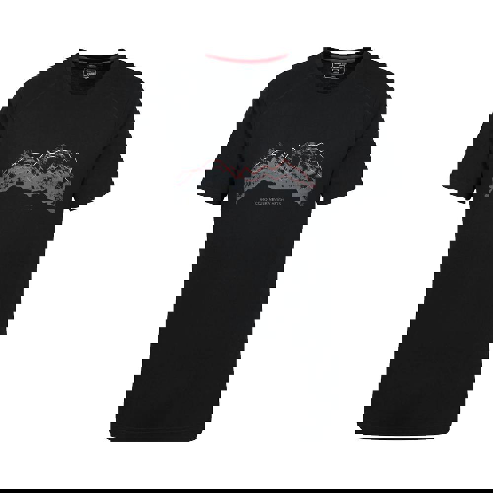 Mountain Warehouse Mens Tech Mountains Organic T-Shirt in black is made from 100% cotton and finished with a mountain print and text design. It has a crew neckline and short sleeves for a classic T-shirt shape suited to everyday wear.