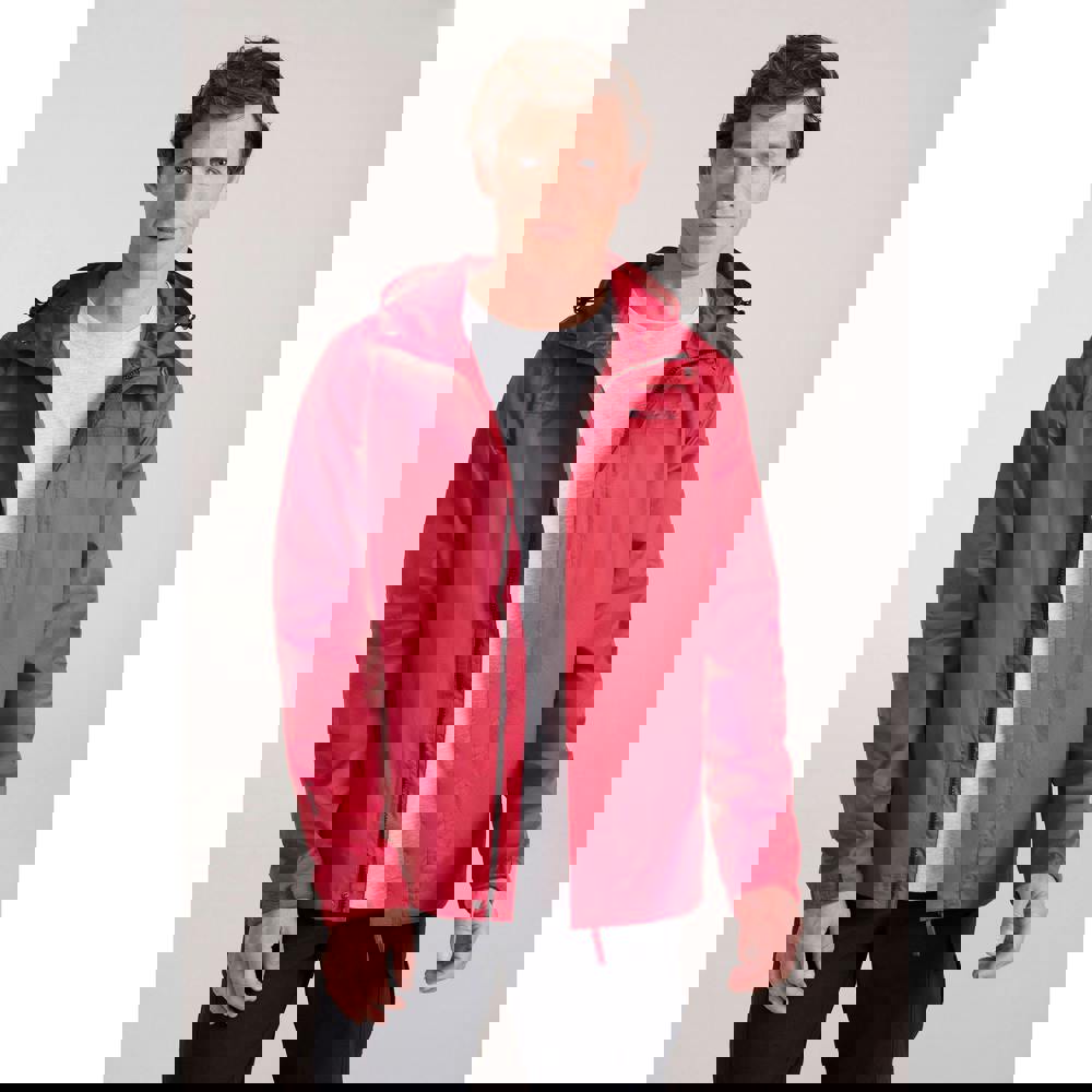 A grown-on hood with a toggle adjuster adds coverage, while the full zip fastening is protected by a studded storm flap. Long sleeves are finished with hook and loop cuff straps, and the curved hem adjusts for a secure feel. Two zipped side pockets keep small essentials close, and the jacket packs away neatly when not in use.