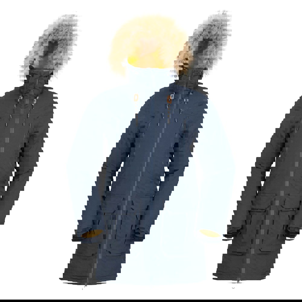 This men’s Traverse Hybrid waterproof jacket is finished in navy with logo and text detailing. It has a hooded neckline with a grown-on hood, drawstring adjustment and a detachable faux fur trim. Long sleeves are completed with hook and loop strap cuffs, while a full zip fastening secures the front.