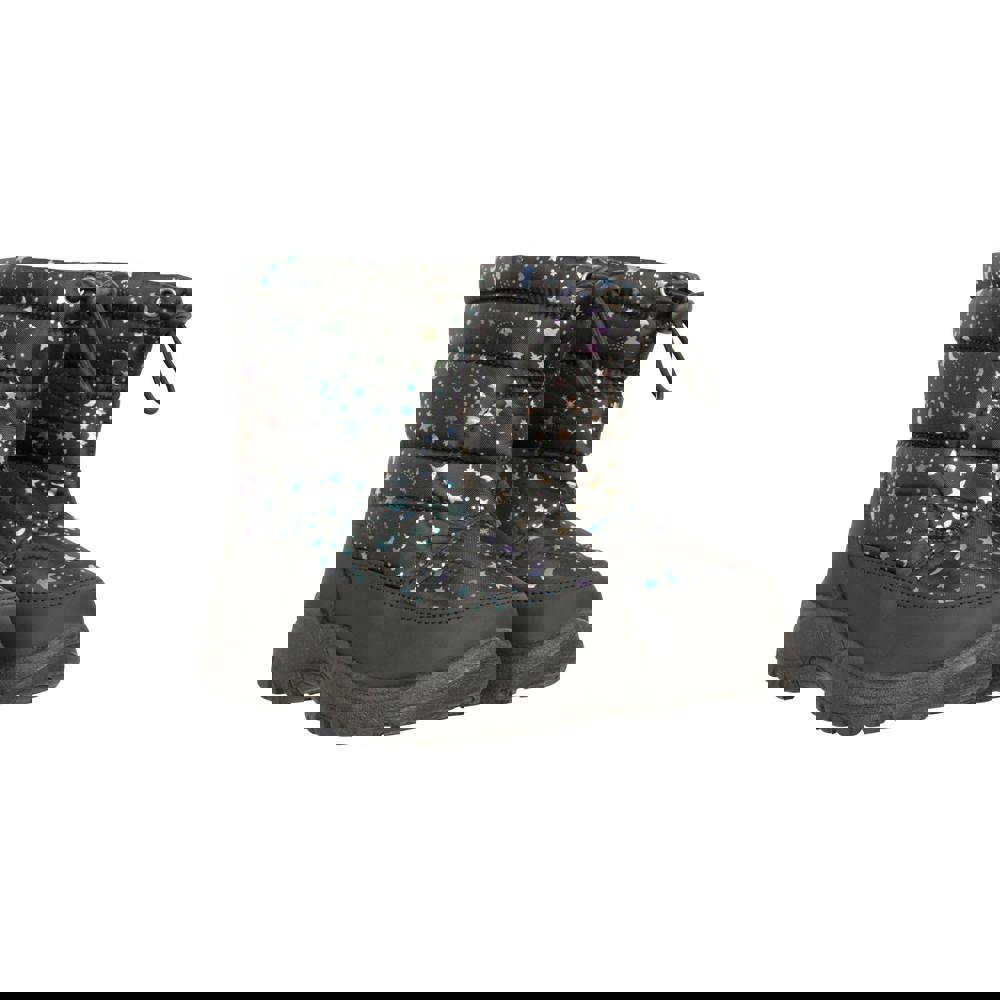 These toddler snow boots from Mountain Warehouse come in an iridescent tie dye design with an ankle cut and a round toe. The upper is made from polyester and the lining uses soft sherpa fleece. A synthetic insole sits inside, alongside a microfibre padded sock for added internal structure.