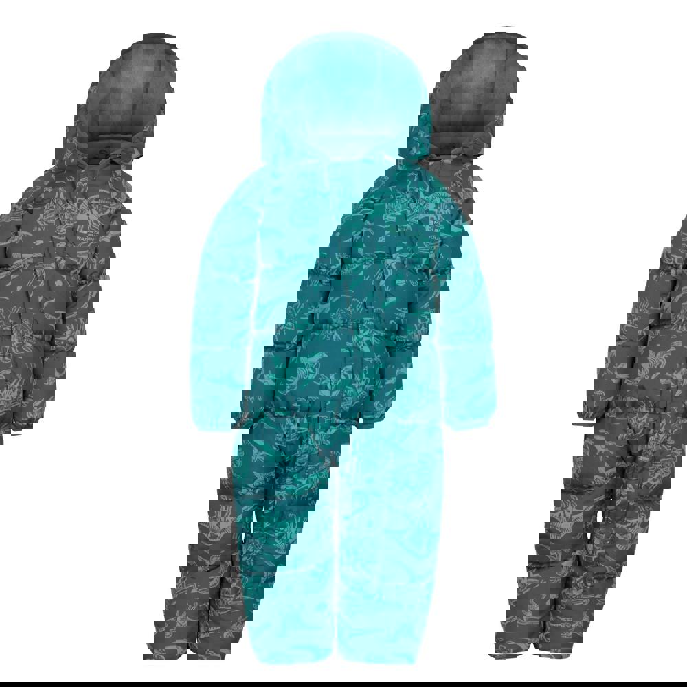 This padded snowsuit from Mountain Warehouse comes in dark teal with a printed cloud design. Made from 100% polyester, it has a soft fleece lining and microfibre filling. The hooded neckline includes a grown on hood, and the long sleeves are finished with stretch turnover cuffs.