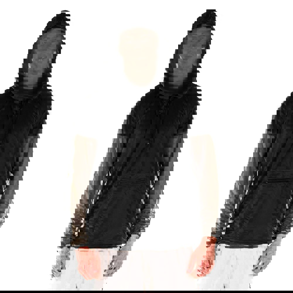 A quarter zip fastening allows quick on-and-off, and a detachable element adds versatility. Storage is kept simple with a single front pocket secured by a zip, suitable for small essentials.