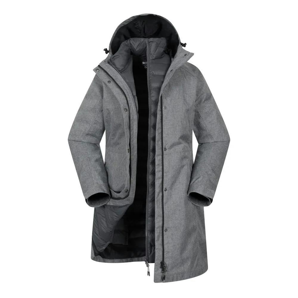 This long 3 in 1 jacket combines an outer layer with a detachable inner jacket for flexible wear. Made from 100% polyester, it has a hooded neckline with a grown on hood and toggle adjuster. Long sleeves are finished with hook and loop cuff straps, while a full zip fastening is protected by a stormflap and stud closure.