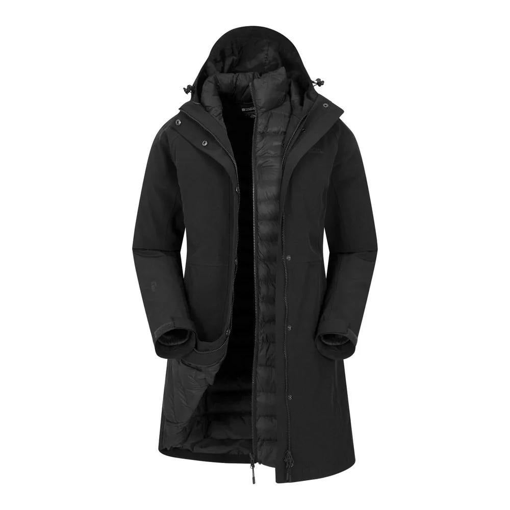This long 3-in-1 jacket combines an outer layer with a detachable inner jacket for flexible wear. It is made from 100% polyester and finished in jet black with logo and text detailing. A grown-on hood with toggle adjuster adds coverage, while long sleeves and hook-and-loop cuff straps allow a secure fit at the wrist.