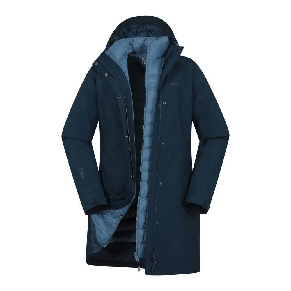 This long 3-in-1 jacket from Mountain Warehouse is made from 100% polyester and comes in navy with a logo and text design. It has a detachable inner jacket for flexible wear and a hooded neckline with a grown-on hood and toggle adjuster.