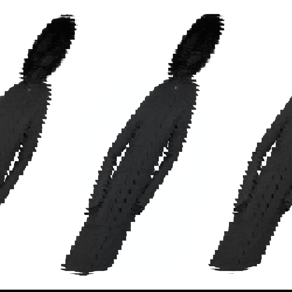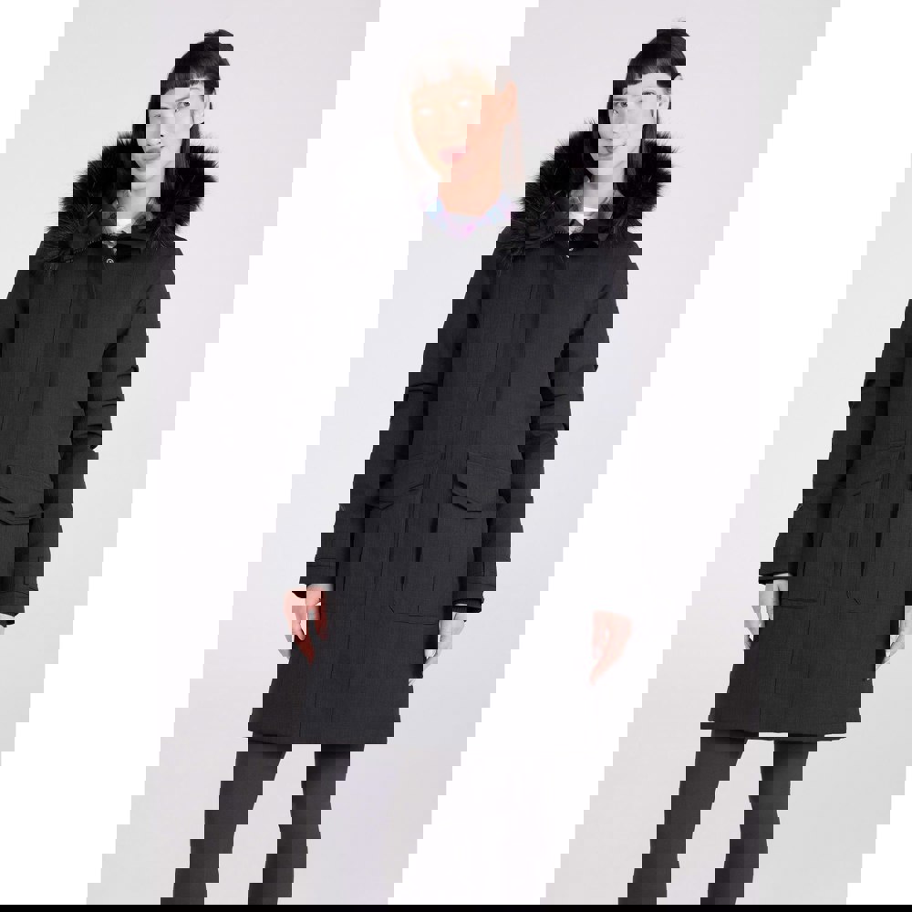 Built for cold-weather wear, this long women’s down jacket combines a nylon outer with a polyester lining and downproof construction. The filling uses 75% white duck down and 25% white duck feather, with thermal testing to -40C. A high neck and hooded neckline add coverage, while the hood includes an adjustable fit and a detachable faux fur trim.